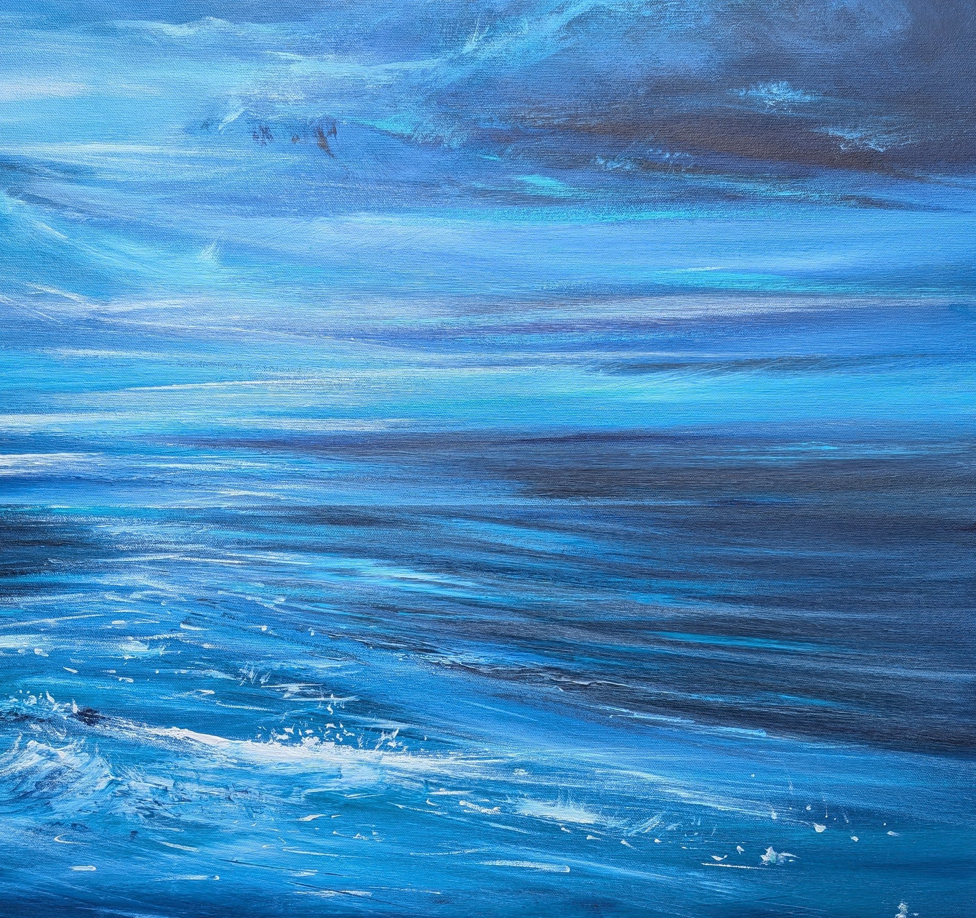 This piece is a clear reflection of my mood. A palette of blues makes for a soulful piece. I thoroughly enjoyed painting this, absolute pleasure.This painting is ethereal, beautiful and transformational. The blue cool hues reflect my inner peace at the time. As always painting is my sanctuary.