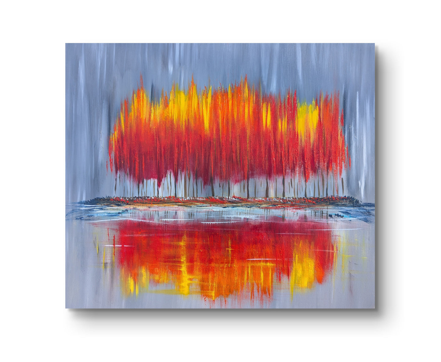 Vivid Silence depicts vibrant trees reflected in a calm body of water. The trees are painted with fiery hues of red, orange, and yellow. Their vertical forms rise from a subtle, misty gray background, creating a stark yet harmonious contrast. Below, the water mirrors the bold colours with softened, blurred strokes, adding a serene and dreamlike quality. The painting captures the quiet beauty of nature in stillness, blending intensity with tranquility.